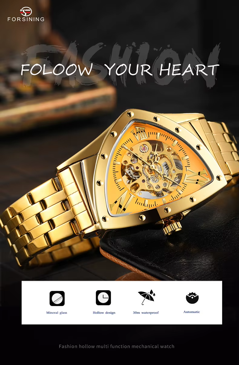 The Forsining Apex is a wearable expression of architectural design and mechanical artistry. Crafted for the man who dares to be different, its distinctive triangular case is a bold departure from convention, making a powerful and elegant statement on the wrist.