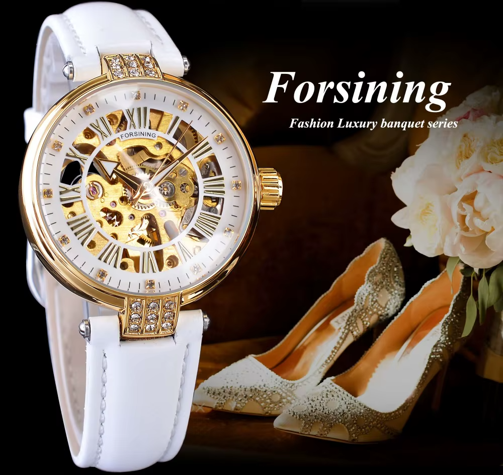 Experience the mesmerizing art of mechanical watchmaking with the Forsining Skeleton ladies’ watch. This exceptional timepiece reveals the intricate beauty of its automatic movement through a carefully designed skeleton dial, allowing you to witness the precise dance of gears and components through its crystal glass front.