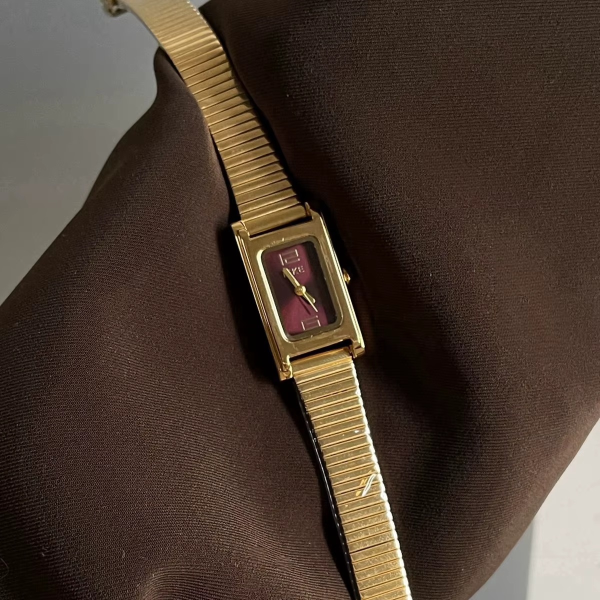 The watch features a beautifully crafted alloy case with a polished finish that complements the rich burgundy dial. The stainless steel band provides both durability and luxurious appeal, while the precise pointer display ensures excellent readability. The harmonious combination of materials and colors creates a watch that stands as both a reliable timekeeper and a statement jewelry piece.