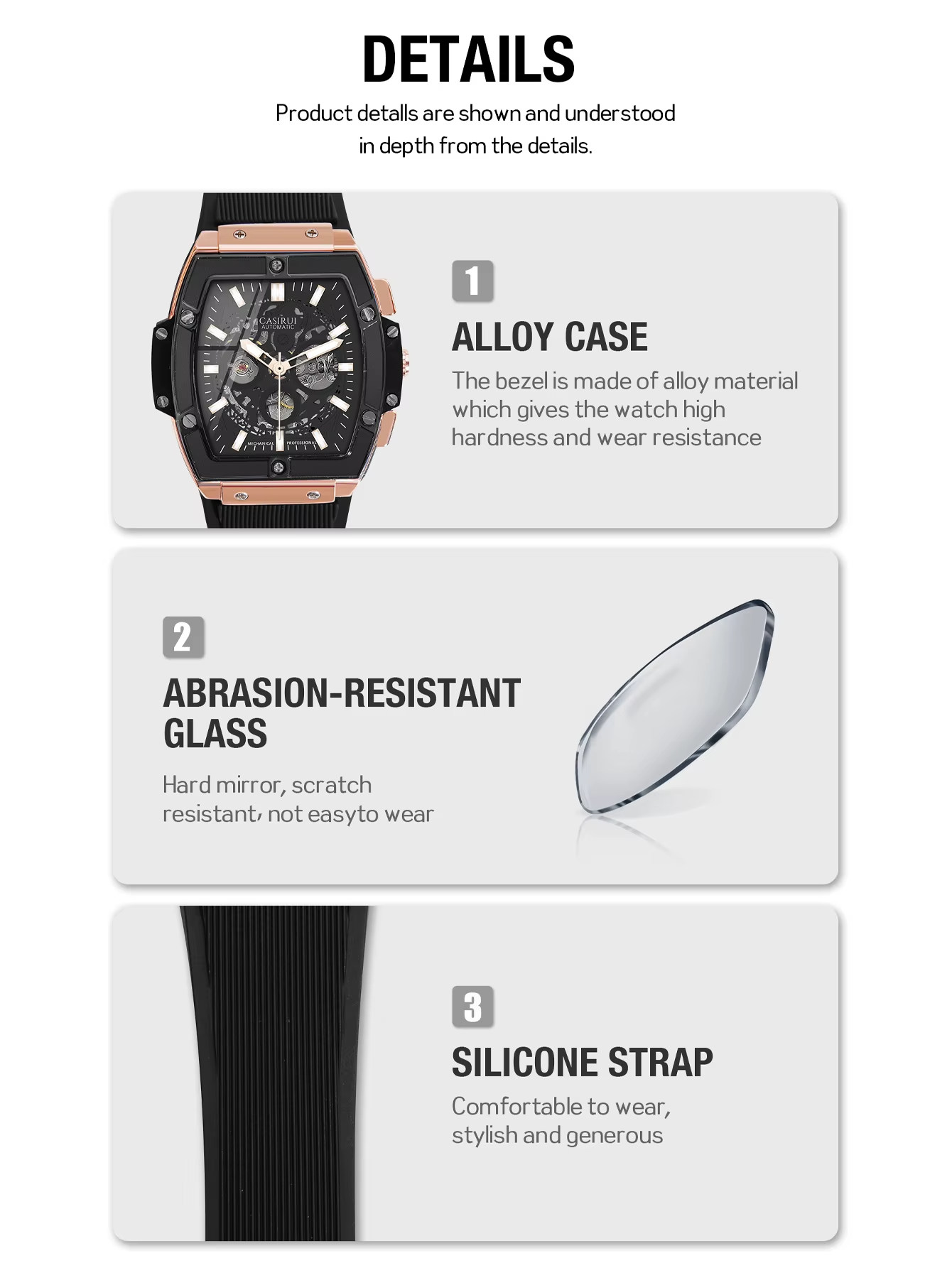 Engineered for Comfort and Durability: Designed for an active lifestyle, the Aethelstan is fitted with a high-quality, 180mm silicone band that provides all-day comfort. The integrated folding clasp with a safety lock ensures the watch remains securely on the wrist. With a water resistance of 3BAR, it confidently withstands splashes and rain.